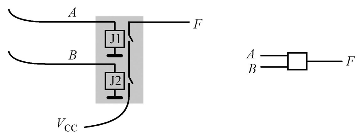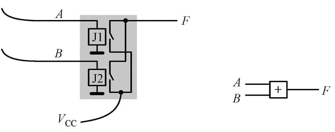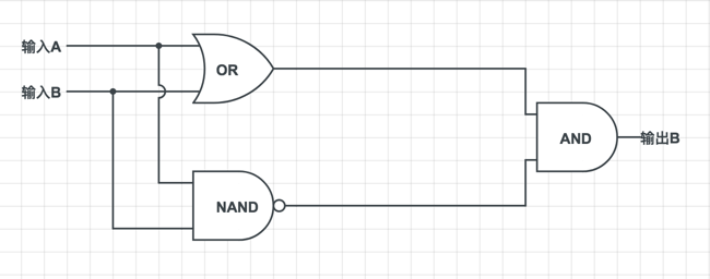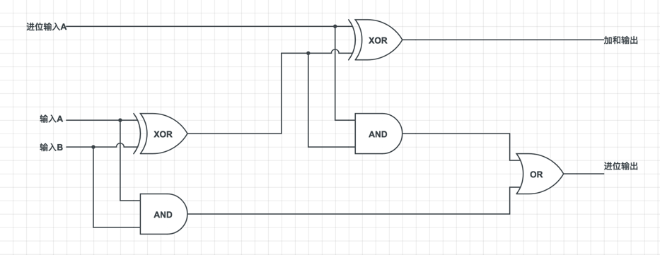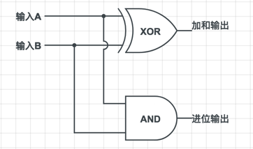 两个二进制数的加和结果是由异或门输出的,而进位结果是由与门输出的。因此我们可以将与门和异或门连接起来计算两个二进制数(即 A 和 B)的和。
