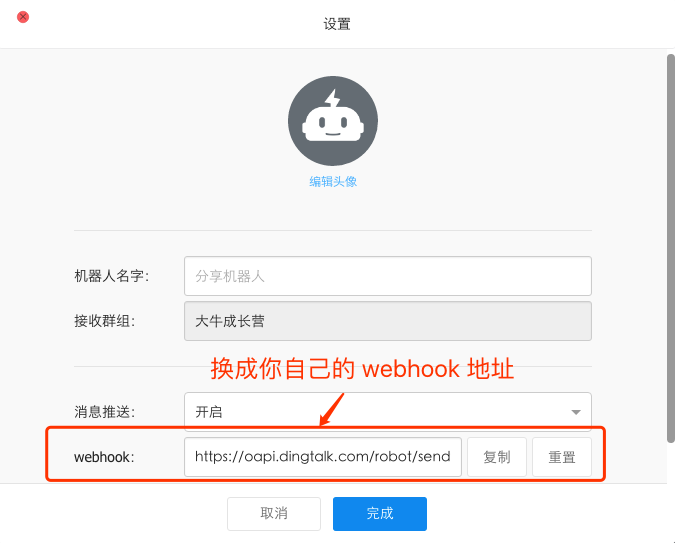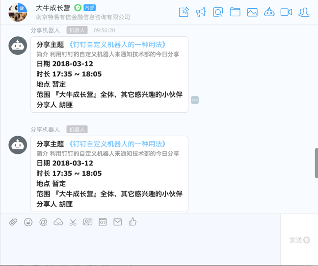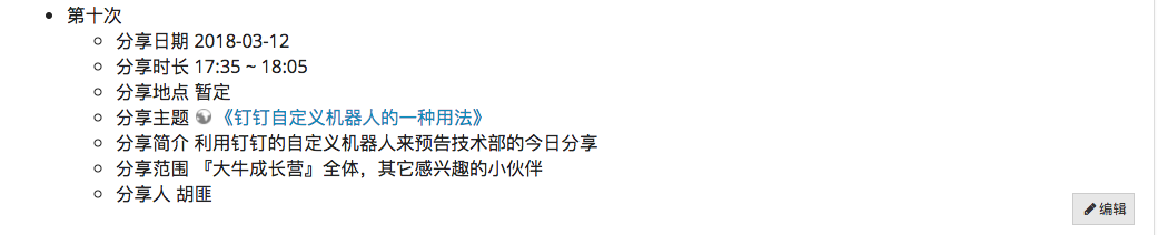 #5. if 今日无分享,do nothing;else 通过钉钉的自定义机器人推送消息 if next_share_content == []: print('next_share_content is null') else: print('next_share_content ',next_share_content) date='' time='' place='' title='' summary='' scope='' author='' href='' for index in range(len(next_share_content)): if '分享日期' in next_share_content[index]: date=next_share_content[index] if '分享时长' in next_share_content[index]: time=next_share_content[index] if '分享地点' in next_share_content[index]: place=next_share_content[index] if '《' in next_share_content[index]: title=next_share_content[index] #将 '分享主题' 四个字替换成 '' 空串,这样就能去除重复的 '分享主题'四个字。 p = re.compile('分享主题') title=p.sub('',title) #取出分享主题的链接 href_list=soup.find_all('a') for i in range(len(href_list)): if title in href_list[i]: href=href_list[i].get('href') break if '分享简介' in next_share_content[index]: summary=next_share_content[index] if '分享范围' in next_share_content[index]: scope=next_share_content[index] if '分享人' in next_share_content[index]: author=next_share_content[index] #如果分享主题没有链接,则正常发主题;否则,把链接也加上。 if href=='': str_list=['{"msgtype":"markdown","markdown":{"title":"今日分享","text":"### **分享主题** **',title,'** \n','###### **',summary[2:],'** \n','##### **',date[2:],'** \n','##### **',time[2:],'** \n','##### **',place[2:],'** \n','##### **',scope[2:],'** \n','##### ',author,' "','}',',"at":{"atMobiles":[],"isAtAll":true}','}'] else: str_list=['{"msgtype":"markdown","markdown":{"title":"今日分享","text":"### **分享主题** [',title,'](',href,')', '\n','###### **',summary[2:],'** \n','##### **',date[2:],'** \n','##### **',time[2:],'** \n','##### **',place[2:],'** \n','##### **',scope[2:],'** \n','##### ',author,' "','}',',"at":{"atMobiles":[],"isAtAll":true}','}'] message=''.join(str_list) print('message', message) #注意点 2:dingding_url 需要替换成你自己钉钉机器人的 webhook 地址 dingding_url='webhook 地址' headers={"Content-Type": "application/json"} r = requests.post(dingding_url, data=message.encode('utf-8'), headers=headers)