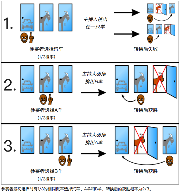 当选手和蒙提霍尔站在这 3 扇门的前面时,这位选手中大奖的概率为 1/3。但是,这档节目却有其微妙之处。当参赛者选定了一扇门,但未去开启它的时候,知道门后情形的蒙提霍尔会开启剩下两扇门的其中一扇,露出其中一只山羊。主持人随后会问参赛者要不要更换为另一扇关着的门?